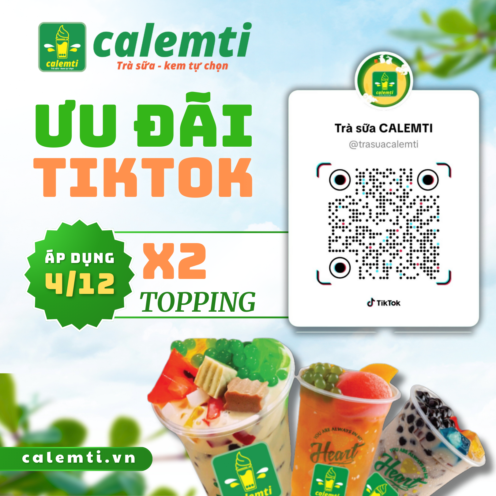 Khách hàng đã follow kênh tiktok CALEMTI sẽ áp dụng ưu đãi x2 topping ngày 4/12/2025.