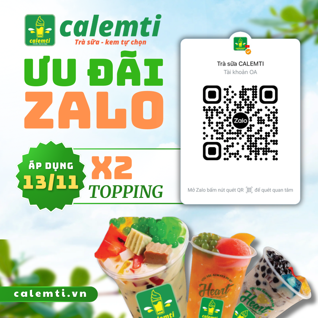 Khách hàng đã bấm quan tâm CALEMTI trên zalo sẽ áp dụng ưu đãi x2 topping ngày 13/11/2025.