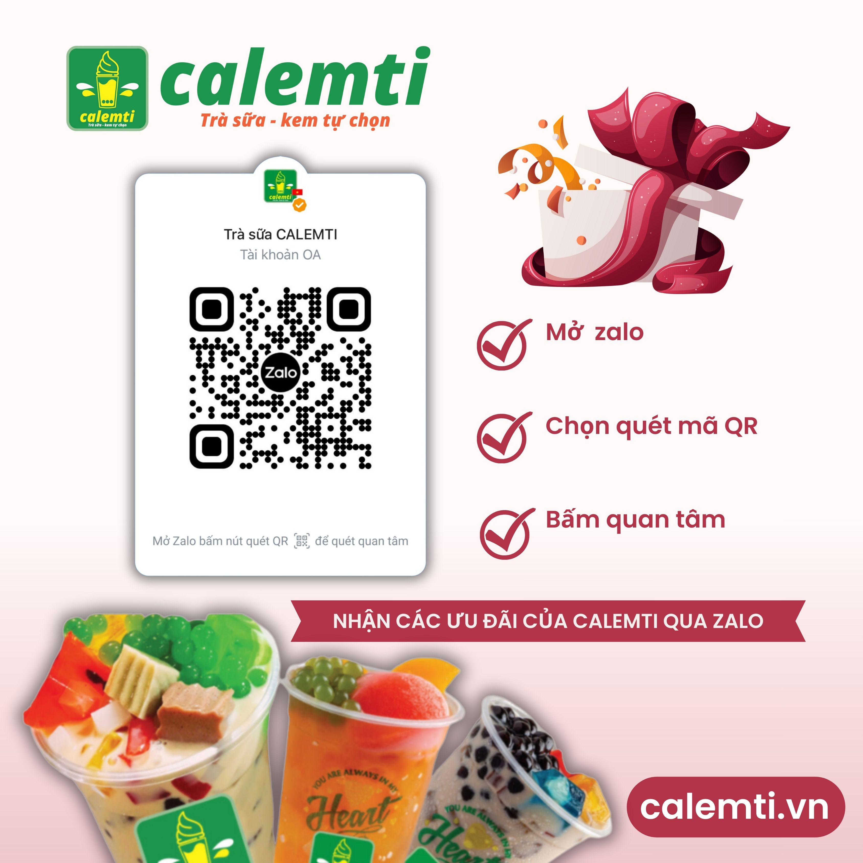 Khách hàng đã bấm quan tâm CALEMTI trên zalo sẽ áp dụng ưu đãi x2 topping ngày 5/9/2025.
